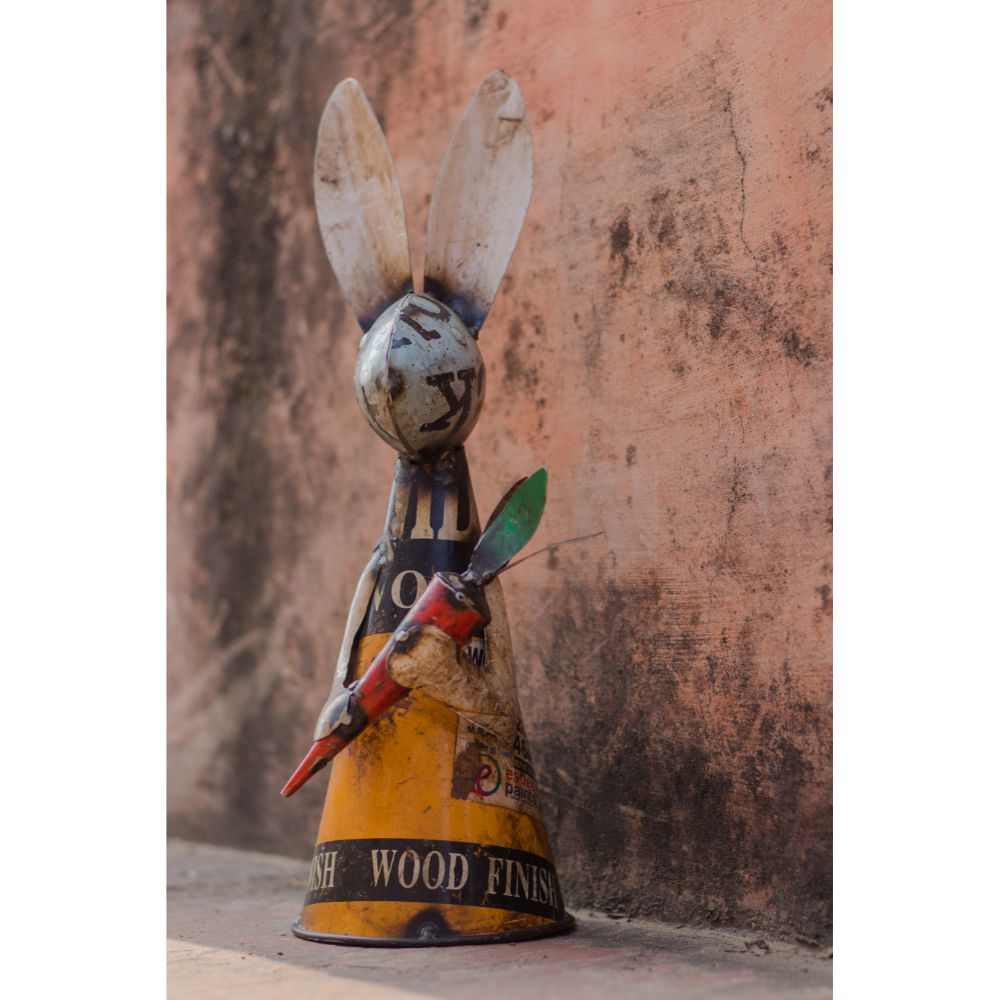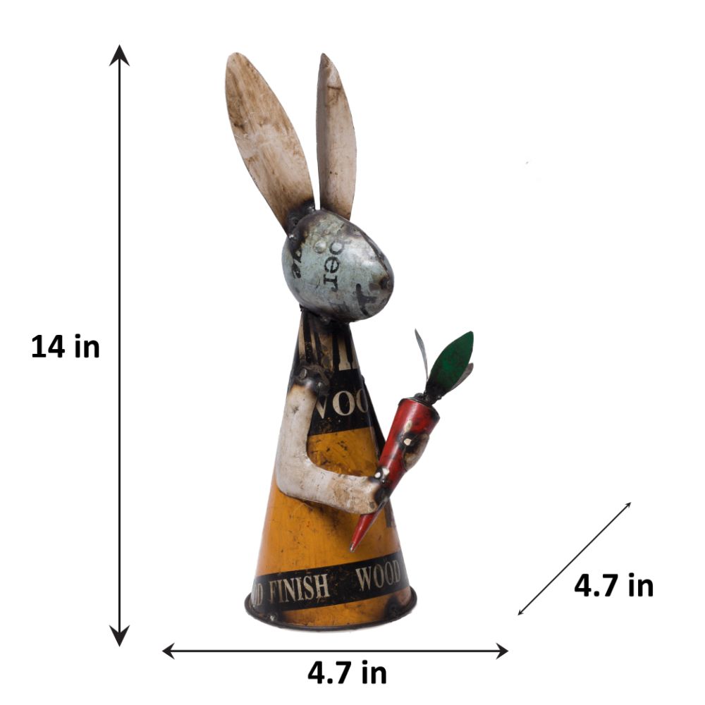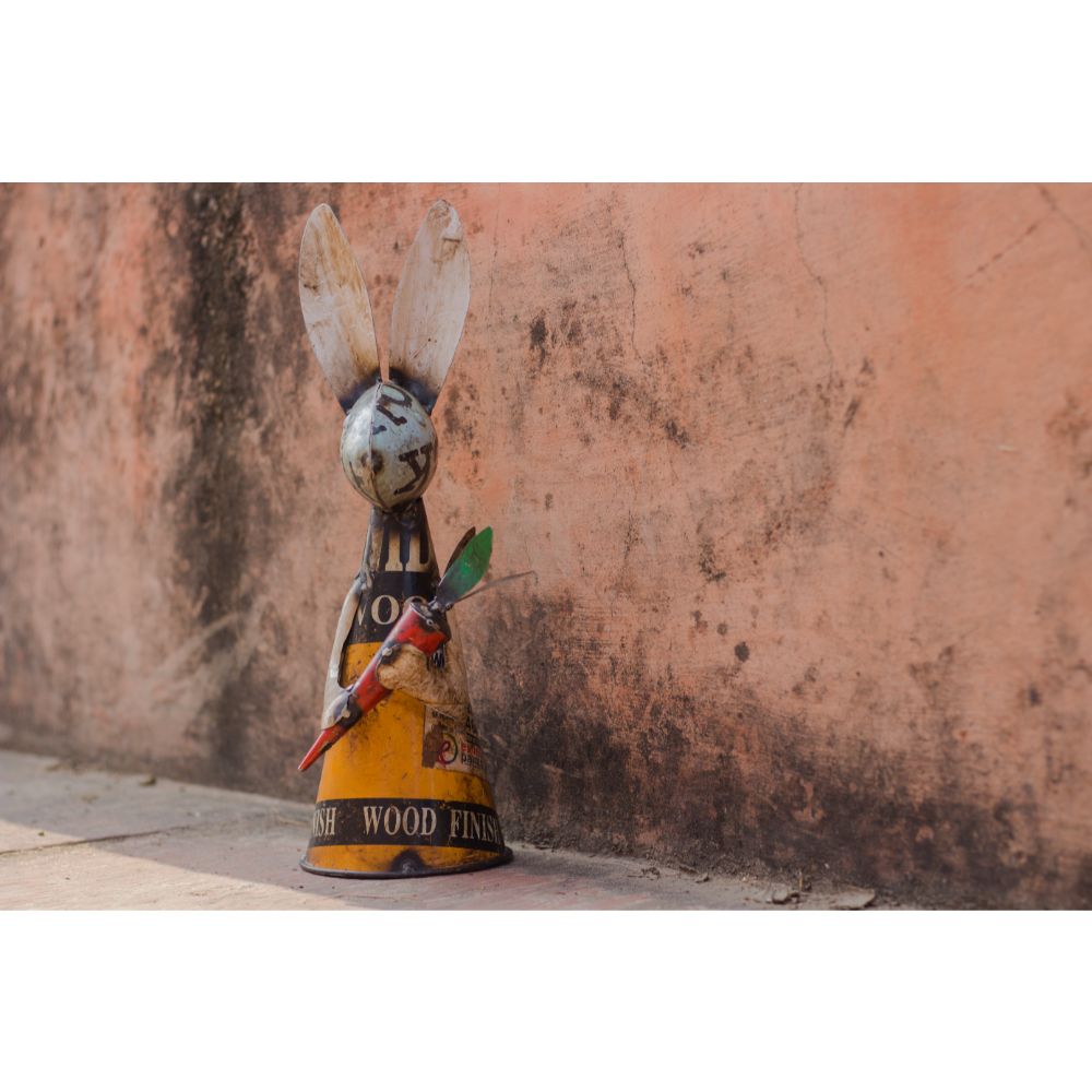 - This rare decorative iron Rabbit with carrot figure is instant Collectible. Meticulously handcrafted, this recycled iron figurine can be used as decorative component installed on the top of the fence that serves the purpose of adding elegance to an otherwise plain fence and to increasing the privacy of your property by increasing the height of your fence. Handmade in Rajasthan, use this pretty Rabbit in the garden and beautify the home with it.